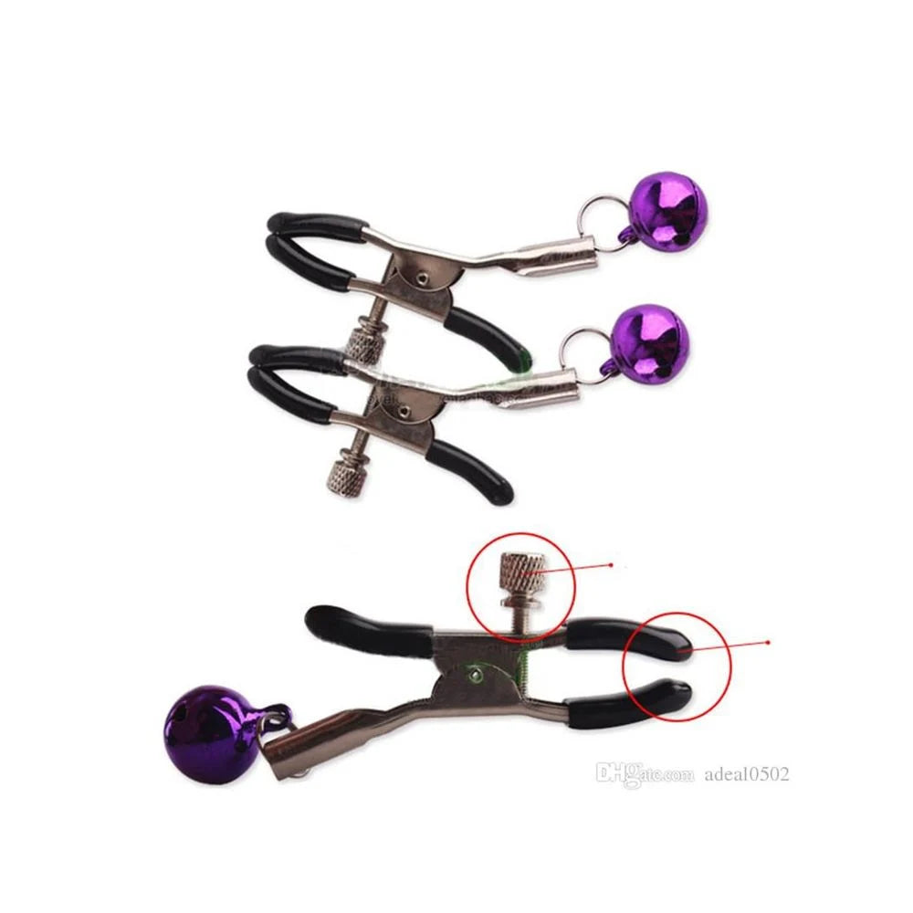 Grampos para os seios em metal com presilhas ajustáveis para diversificar a pressão.